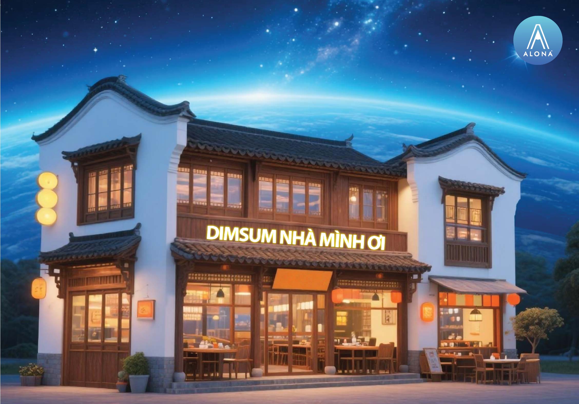 Tàu Alona từ từ hạ cánh xuống tinh cầu DIMSUM Nhà Mình Ơi. Nơi đây toát lên vẻ đẹp ấm cúng, gần gũi như đang trở về chính ngôi nhà của mình. Những hàng tre, những chiếc lồng hấp bốc khói nghi ngút, và mùi thơm dịu nhẹ của dimsum vừa chín tỏa khắp không gian.