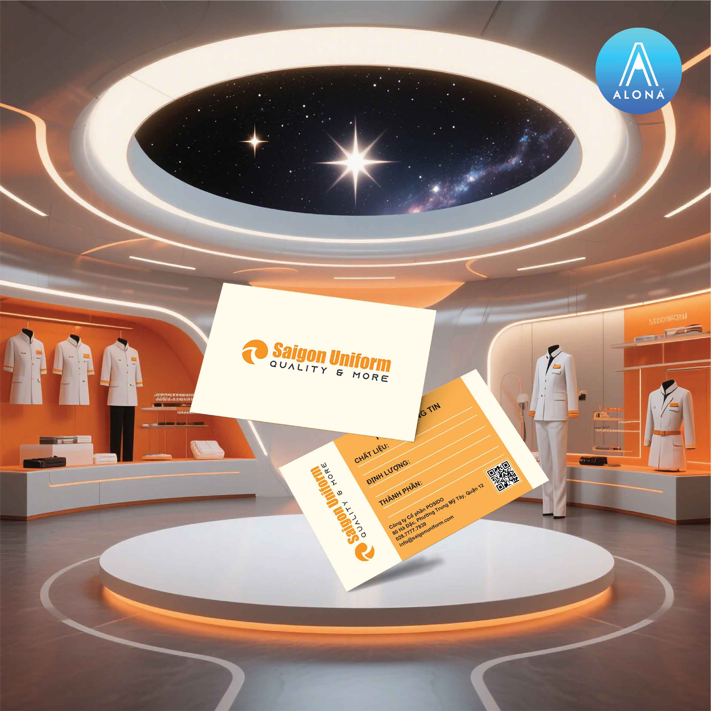 Chào mừng phi hành đoàn Alona đến với Saigon Uniform - Tinh cầu nơi chất lượng và nhiều hơn thế nữa được dệt nên, người đại diện với chiếc áo gam cam trắng thanh lịch bước tới. "Chúng tôi tin rằng, mỗi bộ đồng phục không chỉ là trang phục, mà là câu chuyện về sự chuyên nghiệp, là sợi dây kết nối giữa con người với tổ chức, giữa doanh nghiệp với khách hàng."