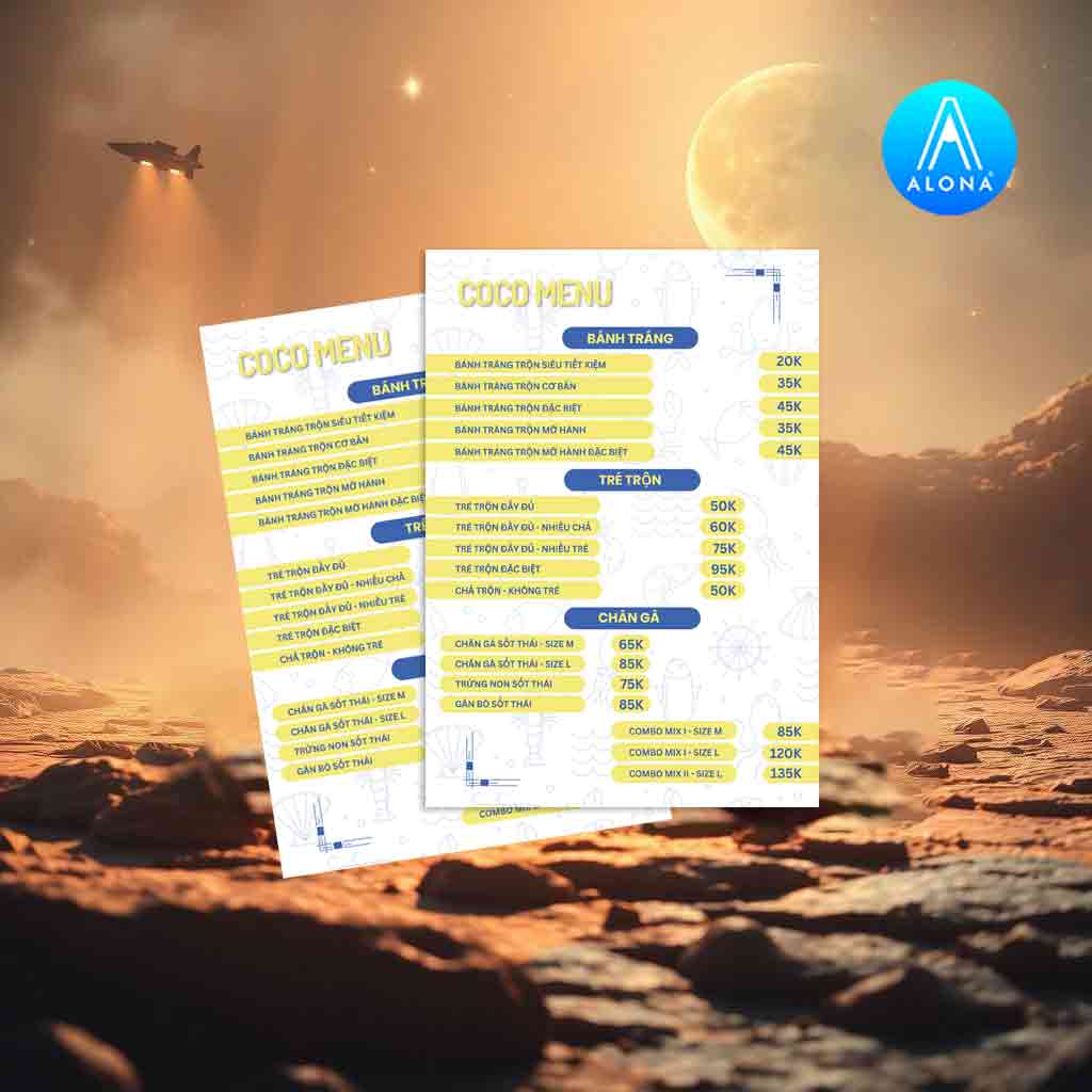 • Menu COCO - Bản đồ vũ trụ ẩm thực, dẫn lối khám phá: Menu được thiết kế như một bản đồ thiên hà thu nhỏ, mỗi món ăn là một hành tinh với câu chuyện riêng. Hình ảnh sống động, màu sắc bắt mắt, menu không chỉ giúp thực khách dễ dàng lựa chọn, mà còn tạo nên trải nghiệm thú vị, khơi gợi sự tò mò và mong muốn khám phá mọi hương vị.