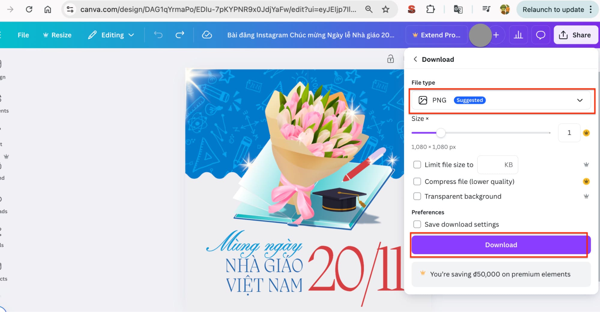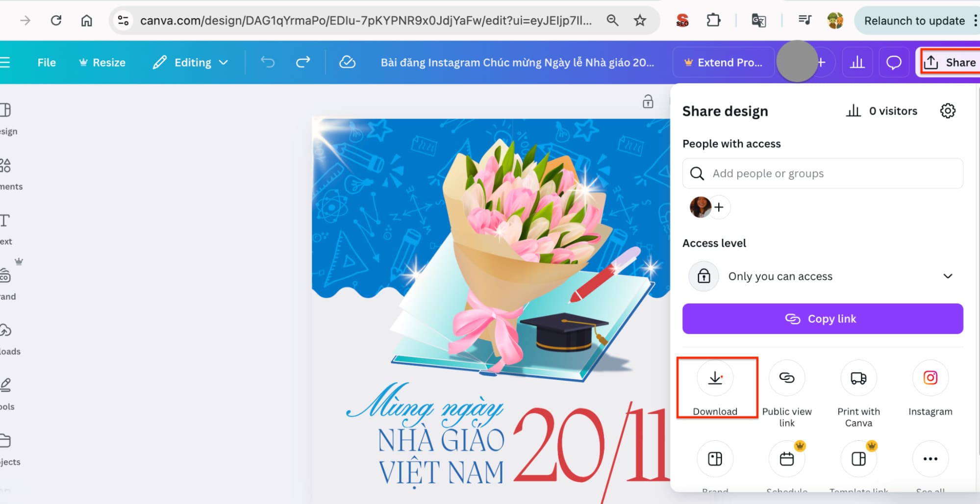 Bước 5: Sau khi hoàn thành thiết kế thiệp, chọn nút share (chia sẻ) ở kế bên, và chọn “download” trong thanh menu xổ xuống.