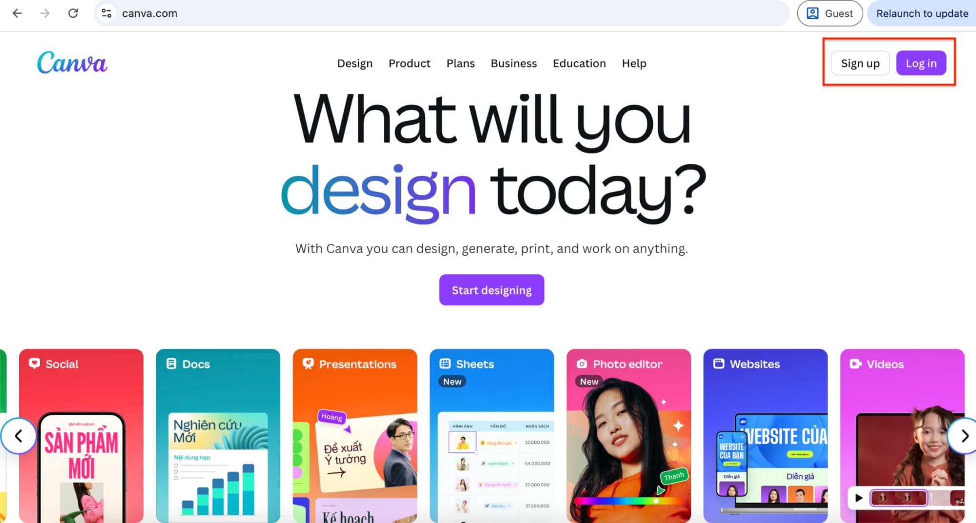 Bước 1: Mở trình duyệt và truy cập vào trang web: https://www.canva.com/, nếu bạn chưa có tài khoản hãy tạo tài khoản trước.