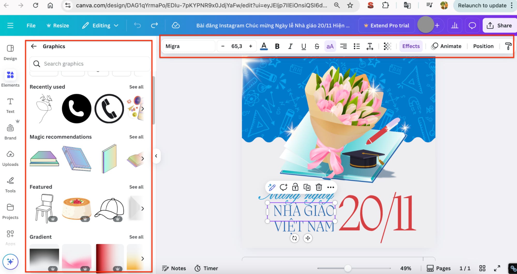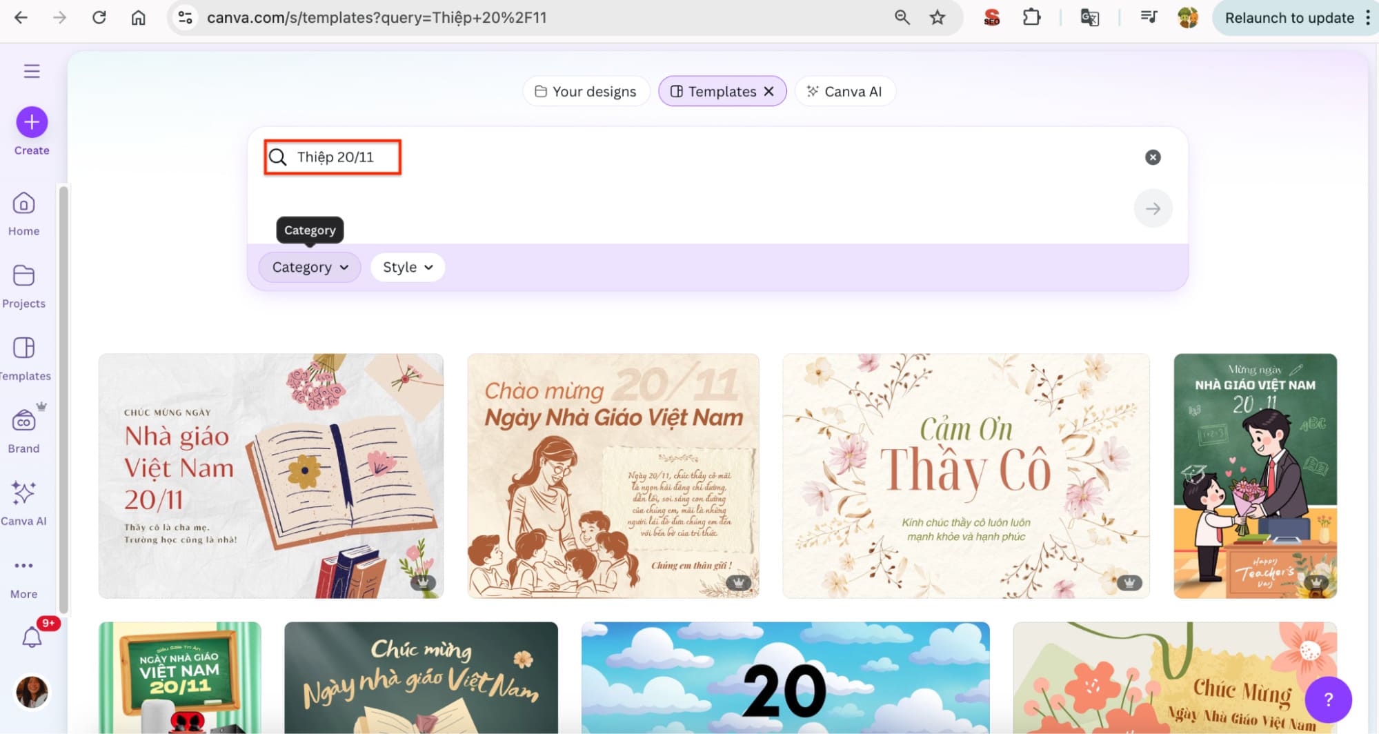Bước 2: Nhập từ khoá thiệp 20/11 vào thanh tìm kiếm. Canva hiển thị hàng loạt mẫu thiệp 20/11, lựa chọn một mẫu bạn thích và chỉnh sửa nó.