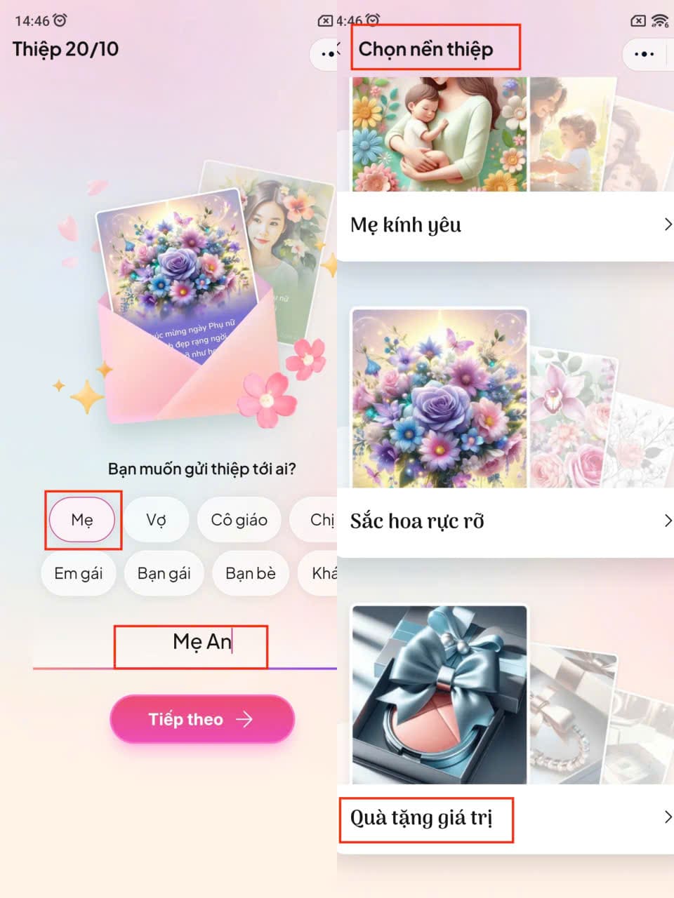 Bước 2: Trong giao diện tạo thiệp, chọn đối tượng muốn gửi lời chúc và tên gọi của họ. Sau đó chọn ảnh nền cho tấm thiệp mà bạn thích.