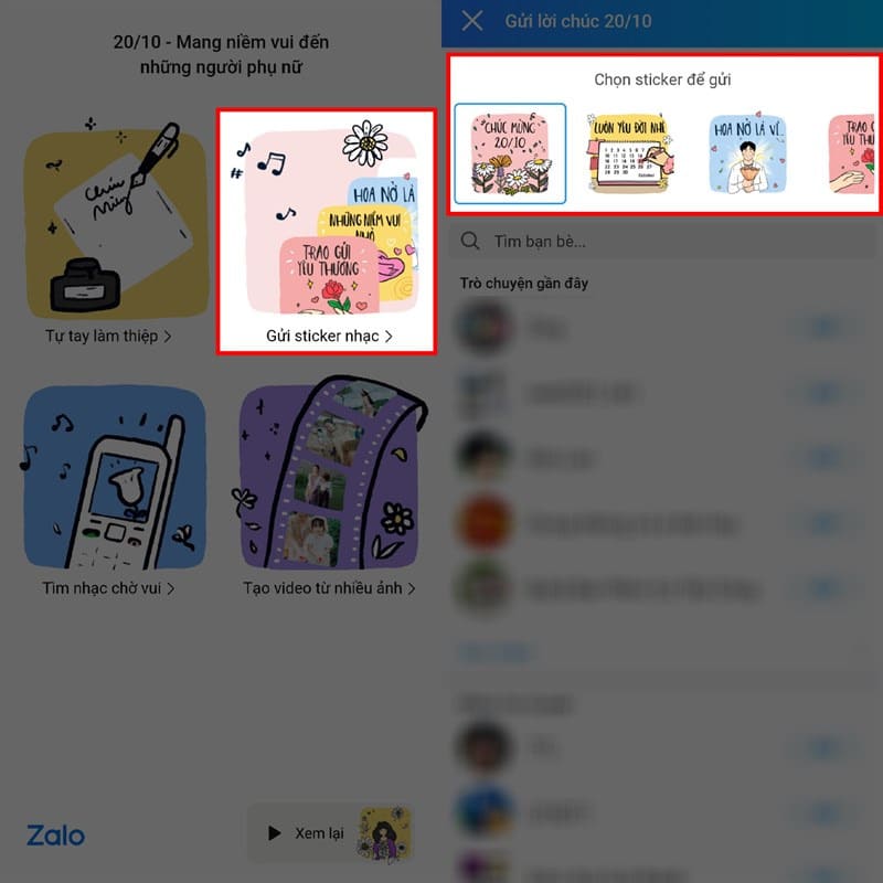 Ngay sau đó, màn hình sẽ hiển thị nhiều mẫu sticker 20/10 khác nhau phù hợp để gửi tặng mẹ, vợ, người yêu hoặc bạn bè. Bạn chỉ cần chọn mẫu sticker mình muốn, rồi nhấn “Gửi” ngay cạnh tên tài khoản Zalo của người nhận.