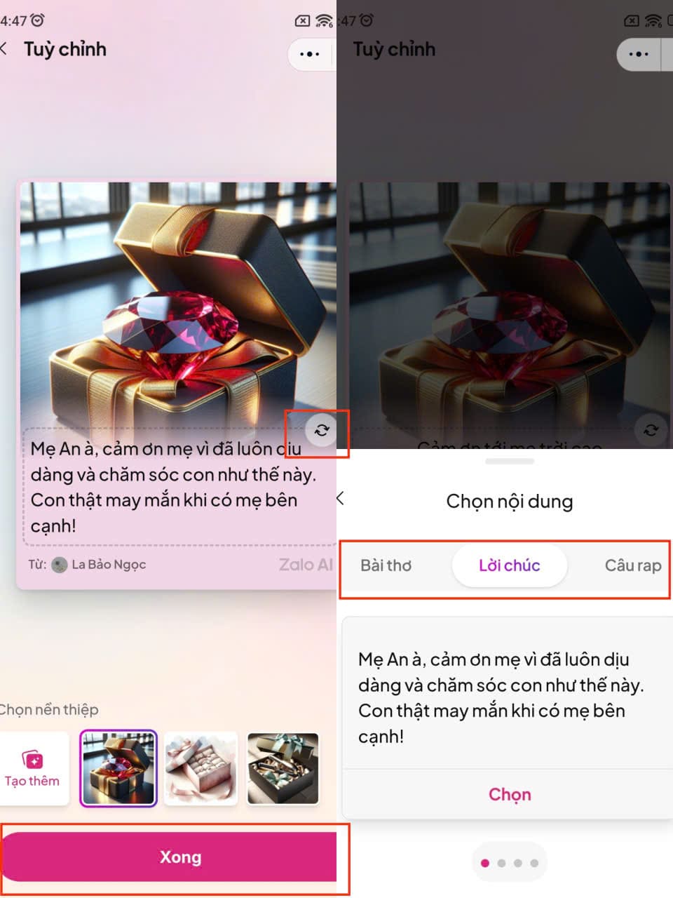 Bước 3: Sau khi chọn thiệp, hãy đợi một lát để Zalo tạo cho bạn lời chúc 20/10. Nếu chưa ưng ý, bạn có thể bấm vào nút “làm mới” như trong hình. Bạn có thể lựa chọn các thể loại lời chúc như là: bài thơ, lời chúc, câu rap. Hãy chọn cho mình lời chúc ưng ý và bấm “ Xong”