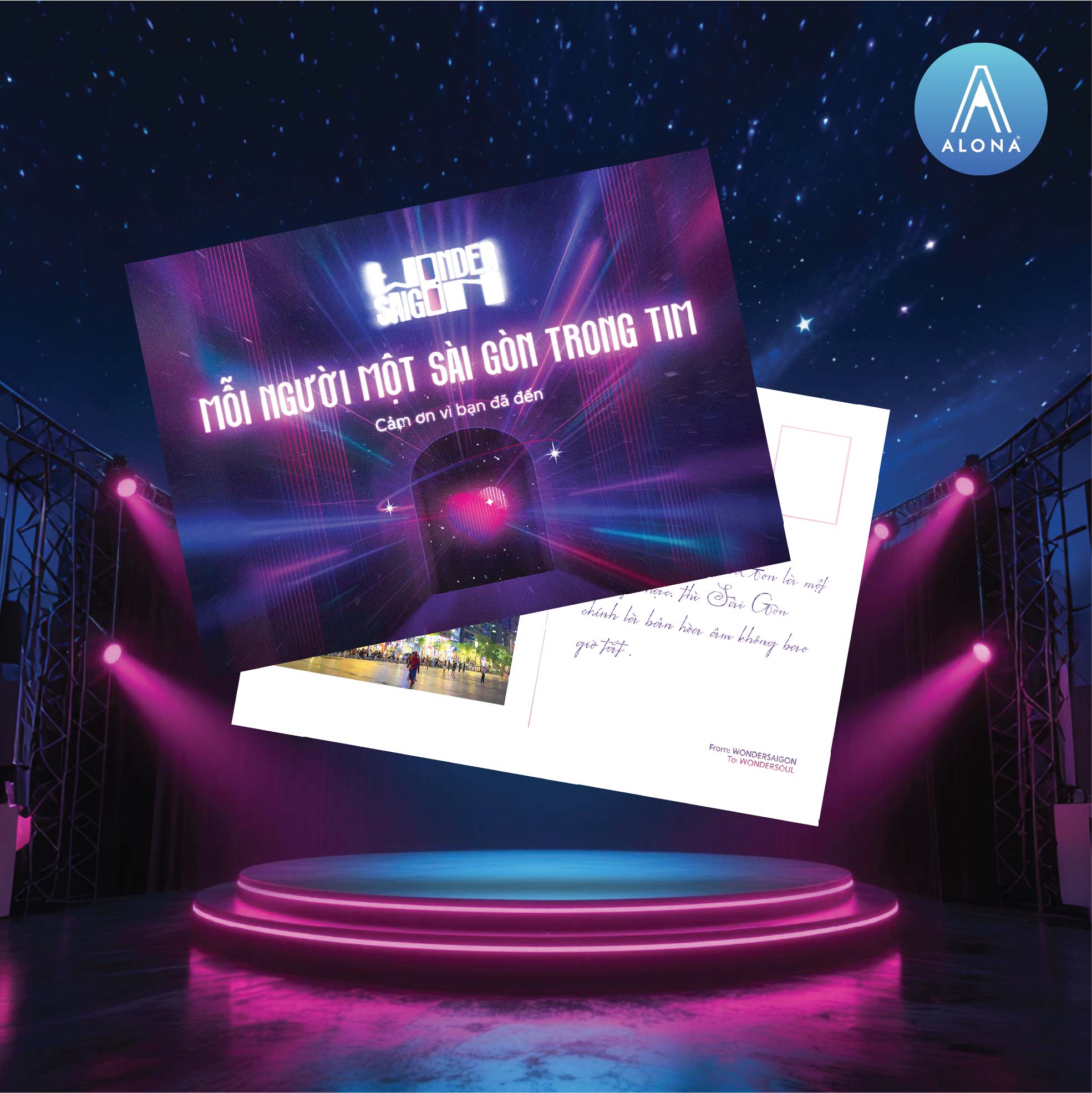 Khi những giai điệu đầu tiên của đêm nhạc vang lên, cũng là lúc tàu Alona chuẩn bị rời bến. Nhìn từ cửa sổ phi thuyền, những ấn phẩm của Alona hòa quyện cùng ánh đèn neon tạo nên một khung cảnh huyền ảo, rực rỡ.