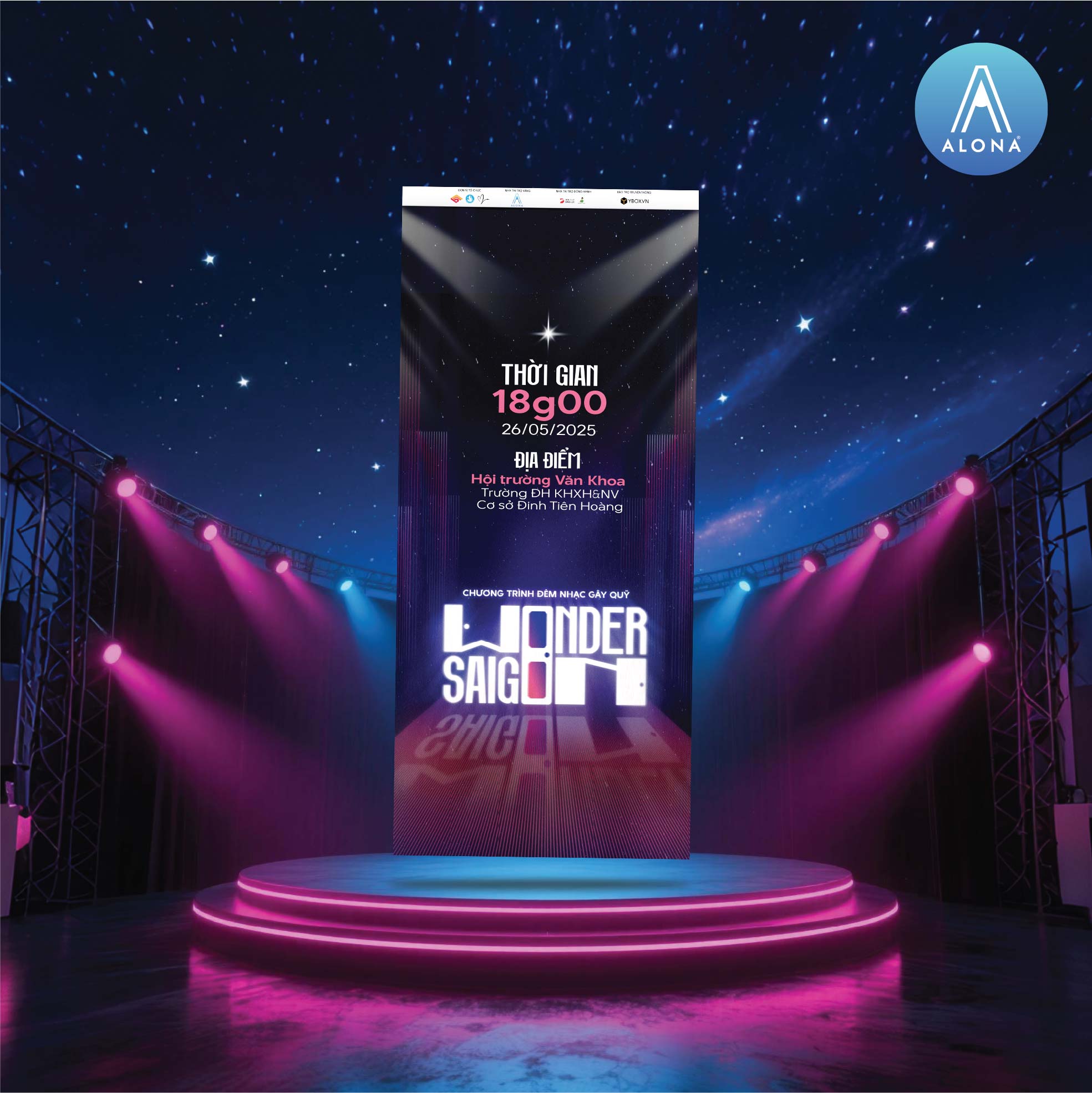 PP Wonder Saigon - Cánh cửa dẫn vào thế giới Concert: Chúng tôi sử dụng chất liệu PP cao cấp để tái hiện lại Visual sân khấu chân thực nhất. Với thiết kế bố cục dọc trung tâm và hiệu ứng đèn Spotlight chiếu từ hai bên, mỗi tấm PP như một cánh cổng đưa người xem đứng trực diện trước sân khấu lung linh, nơi logo Wonder Saigon phản chiếu rực rỡ trên sàn diễn ảo ảnh.
