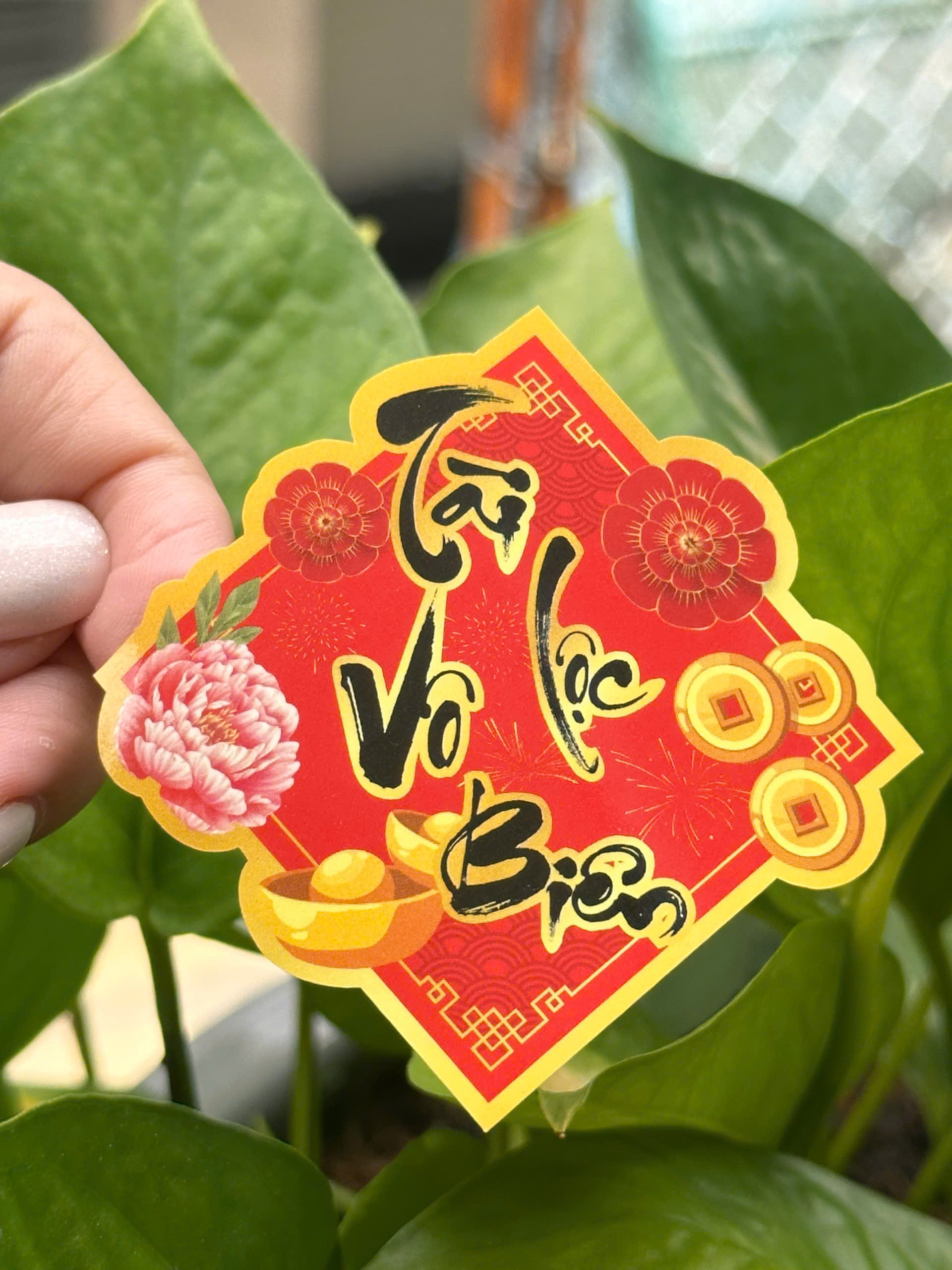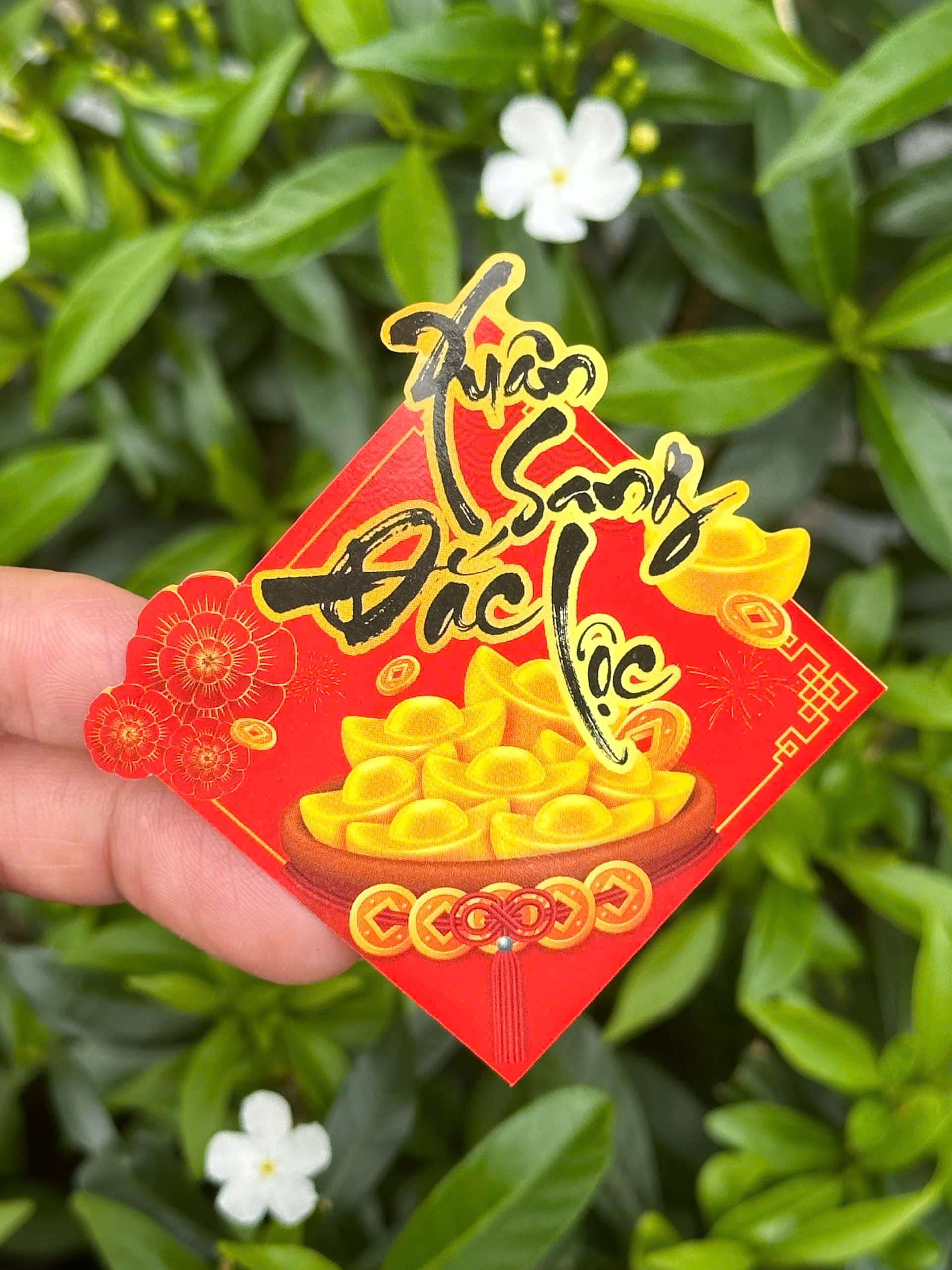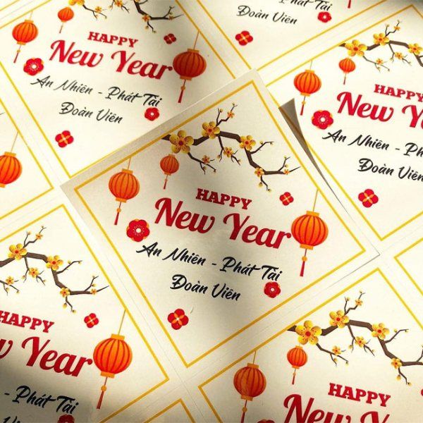 Tem có thể in lời chúc năm mới, biểu tượng linh vật, câu chúc tài lộc – thịnh vượng mang ý nghĩa phong thủy tốt lành.