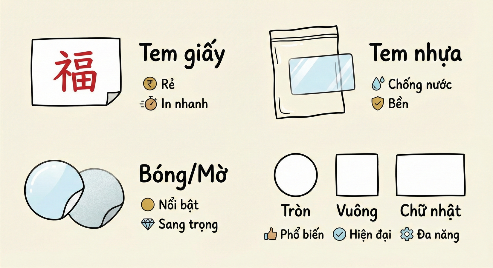 Từ quà biếu doanh nghiệp, quà Tết khách hàng đến giỏ quà bán lẻ, tem dán đều giúp tăng độ tin cậy và tính chuyên nghiệp.