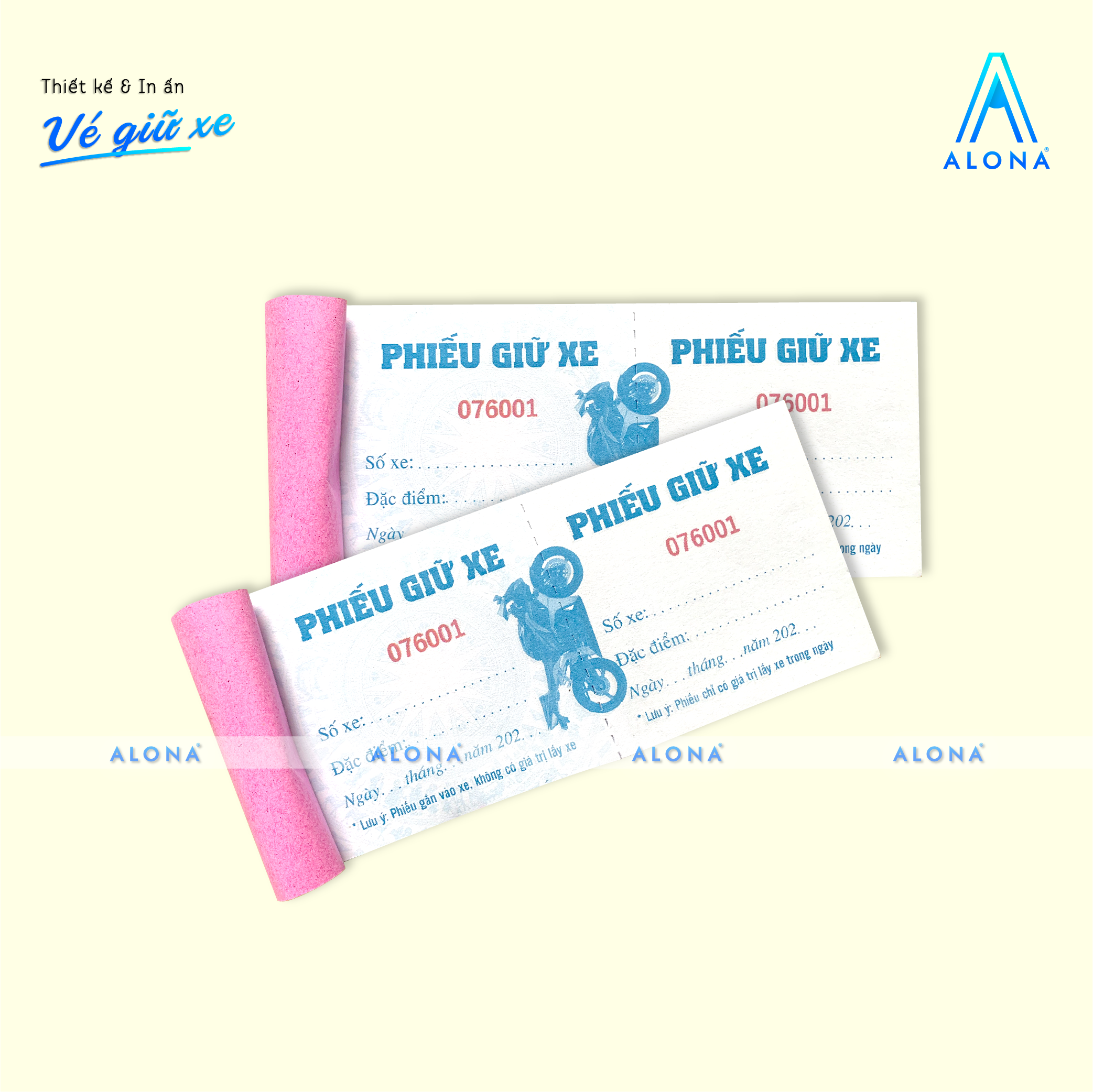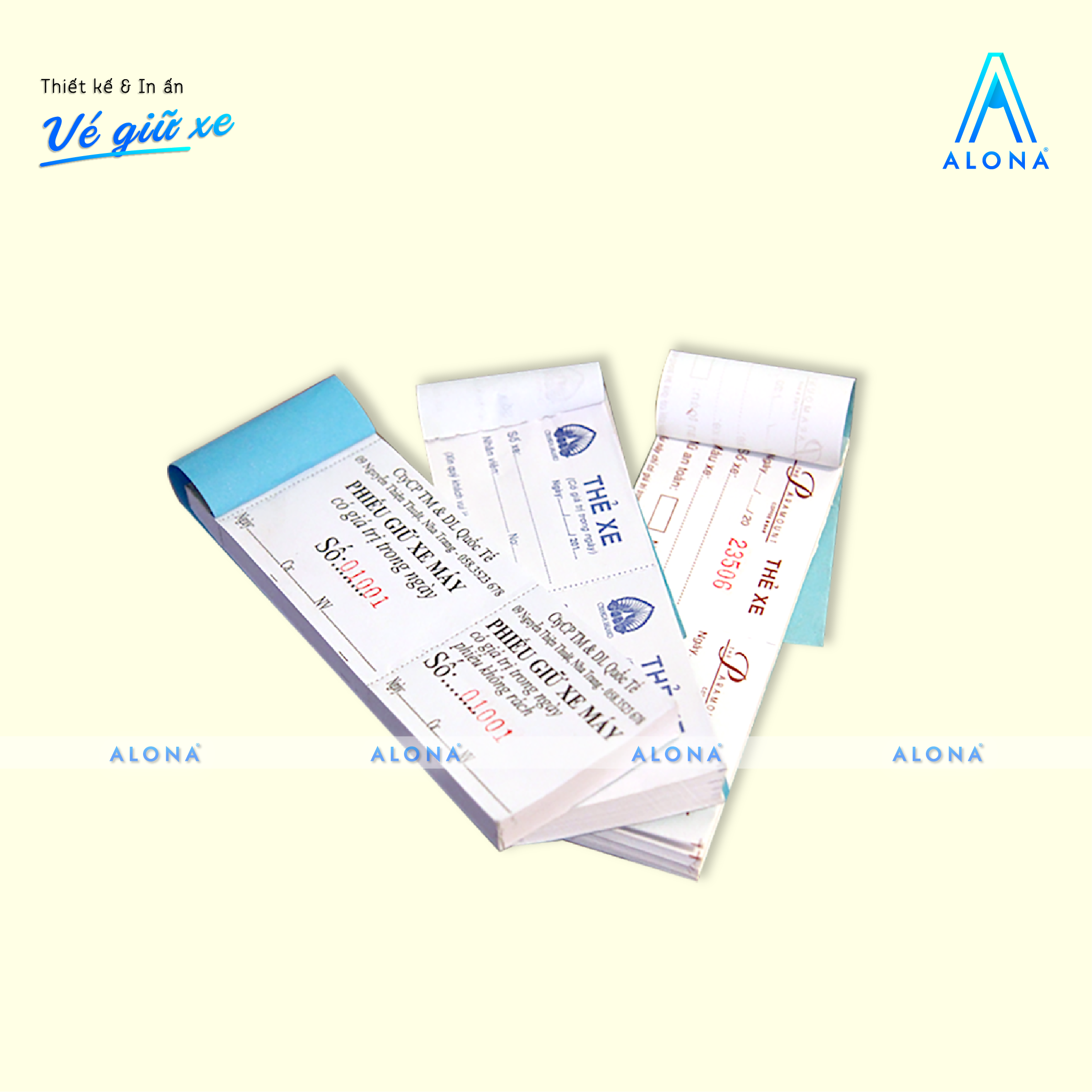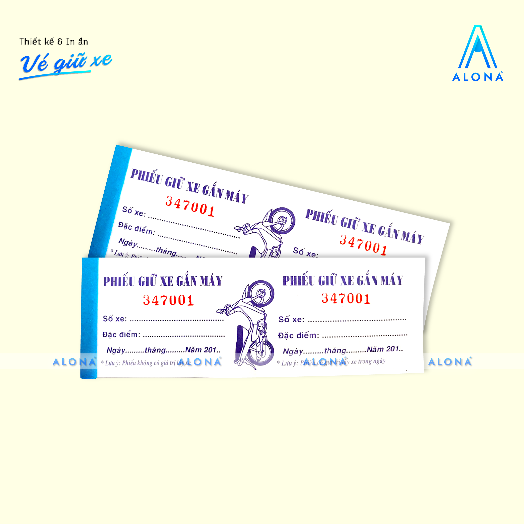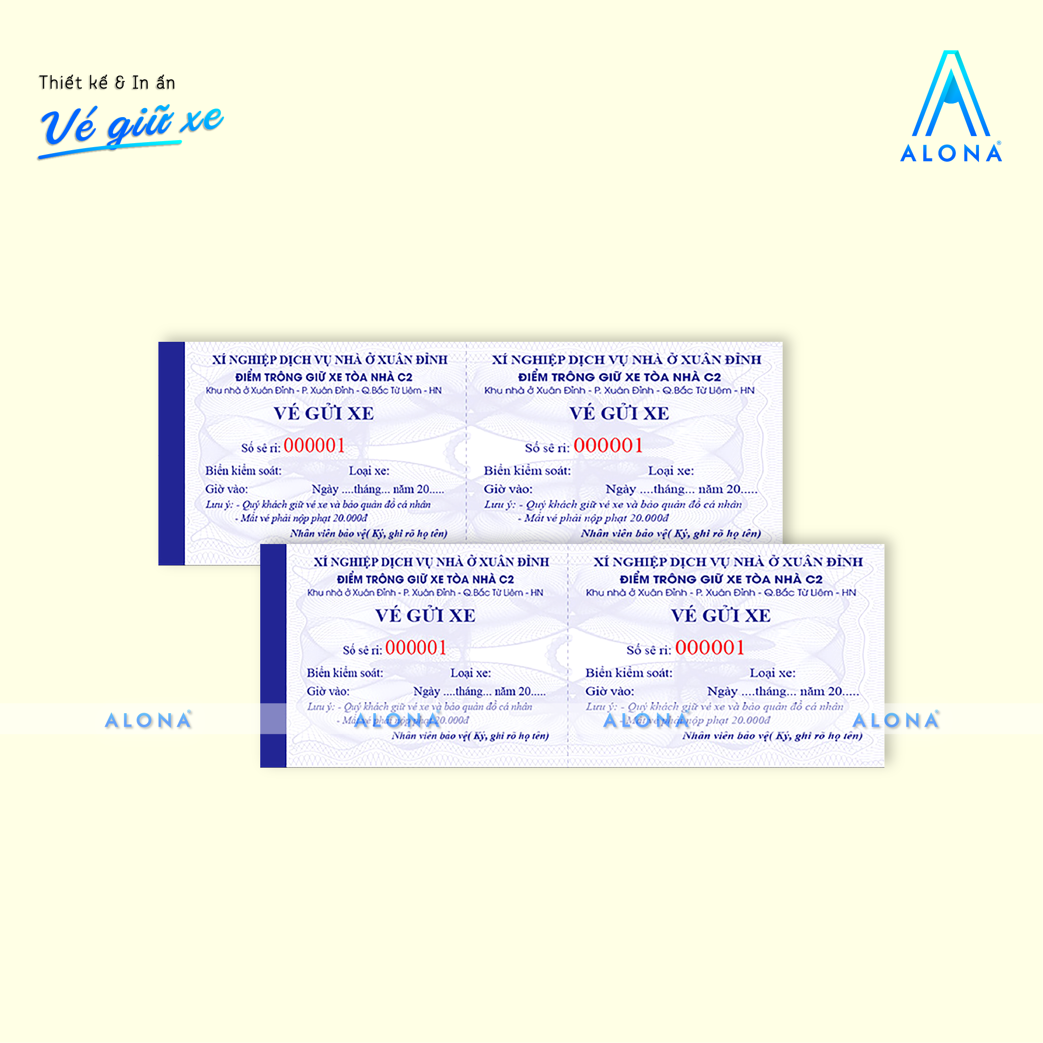 Alona mang đến giải pháp thiết kế vé giữ xe vừa tiện dụng vừa đảm bảo tính thẩm mỹ và chuyên nghiệp cho doanh nghiệp, bãi giữ xe hoặc trung tâm thương mại. Với đội ngũ thiết kế sáng tạo, chúng tôi giúp bạn sở hữu những mẫu vé rõ ràng, dễ sử dụng, đồng thời thể hiện đồng bộ hình ảnh thương hiệu trong từng chi tiết.