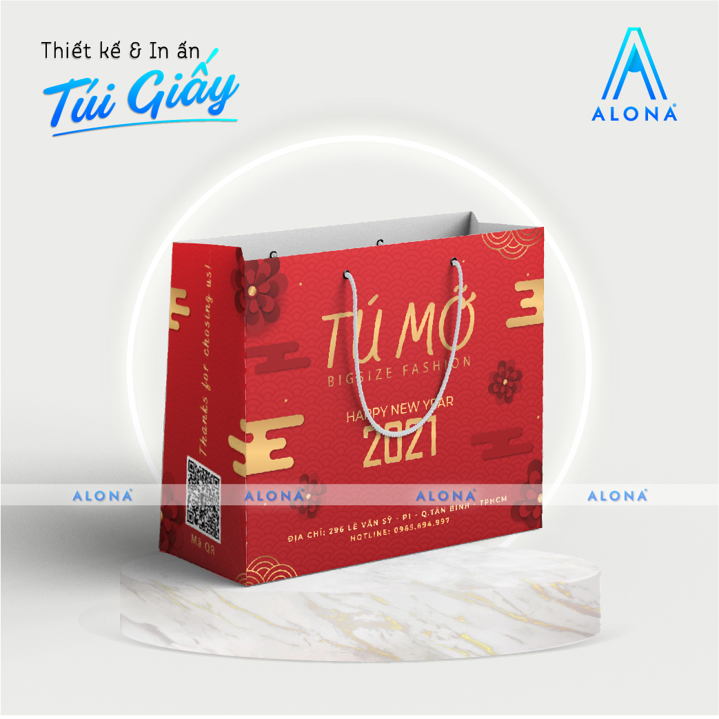 Mô hình cấu trúc của túi giấy là “cái nền”, thể hiện kích thước, kiểu dáng, khả năng chịu lực của sản phẩm. Toàn bộ thông tin, thông điệp mà khách hàng muốn truyền tải sẽ được các chuyên viên tại Alona thể hiện độc đáo và sắc nét trên nền túi.