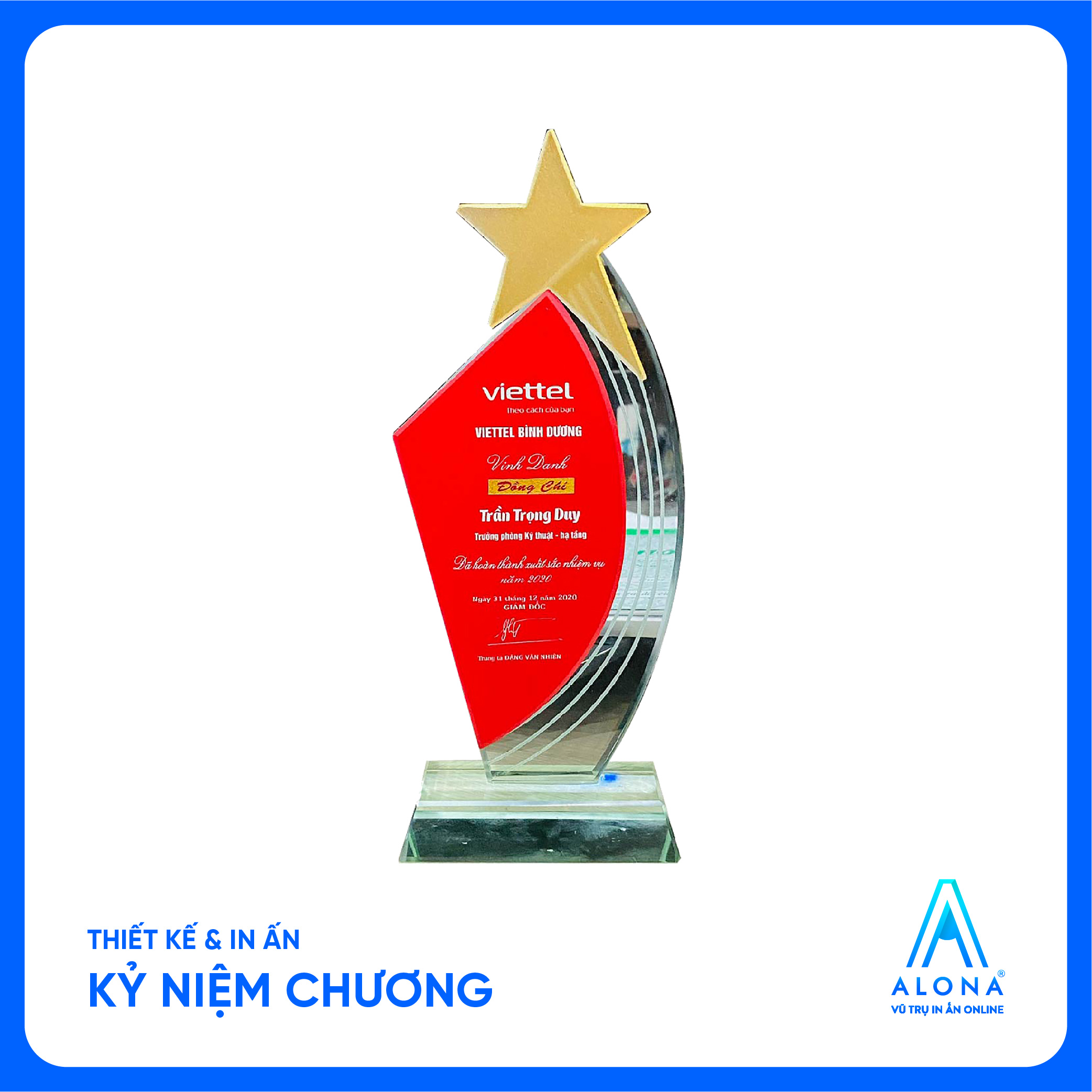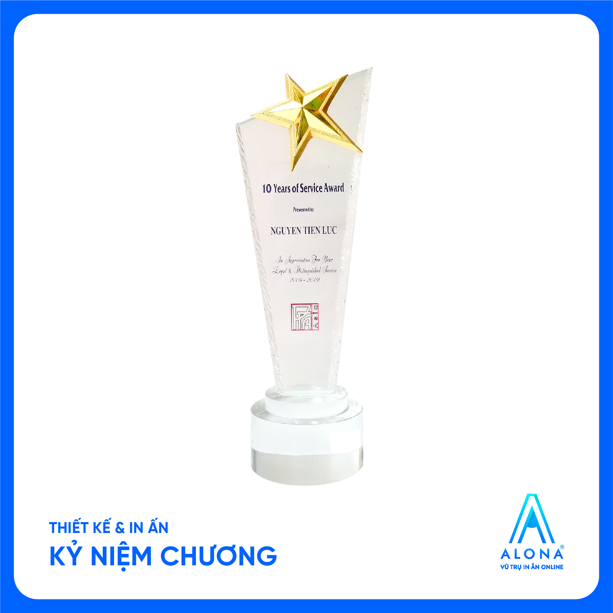 Vũ trị in ấn Alona là đơn vị với nhiều năm kinh nghiệm sản xuất, làm kỷ niệm chương nhận được nhiều sự tin tưởng của nhiều người tiêu dùng. Với 10 năm kinh nghiệm cùng đội ngũ nhân viên lành nghề, luôn đặt cái tâm cho từng sản phẩm làm ra.