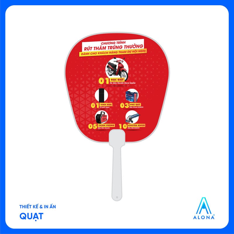 | Quạt nhựa PP | Làm từ nhựa PP, thông tin được in trực tiếp lên bề mặt | Chống nước, chống bẩn, bền | 16x16cm, 17x17cm, 18x18cm,... |