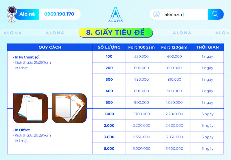 Alona cung cấp dịch vụ in giấy tiêu đề, letterhead theo yêu cầu với đa dạng giá cả, chất liệu. Dưới đây là bảng giá in ấn trực tuyến. Giá in ấn sẽ thay đổi tùy thuộc vào công nghệ in, số lượng, thời gian, …