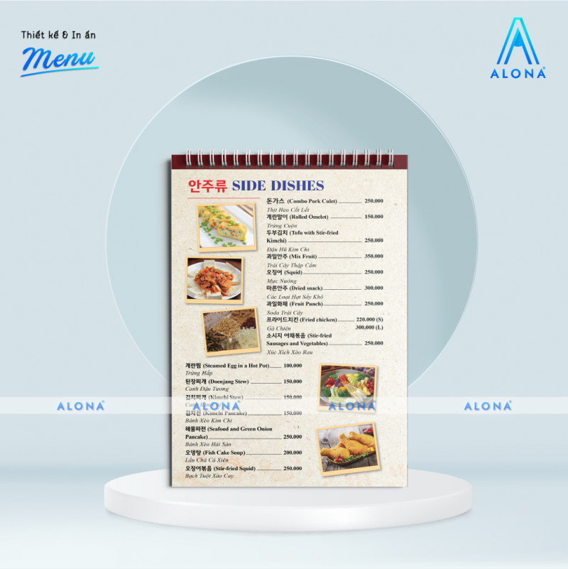 In Ấn Chất Lượng: Với trang thiết bị hiện đại, Alona đảm bảo rằng mỗi cuốn menu in ra đều có chất lượng hình ảnh và màu sắc tốt nhất.