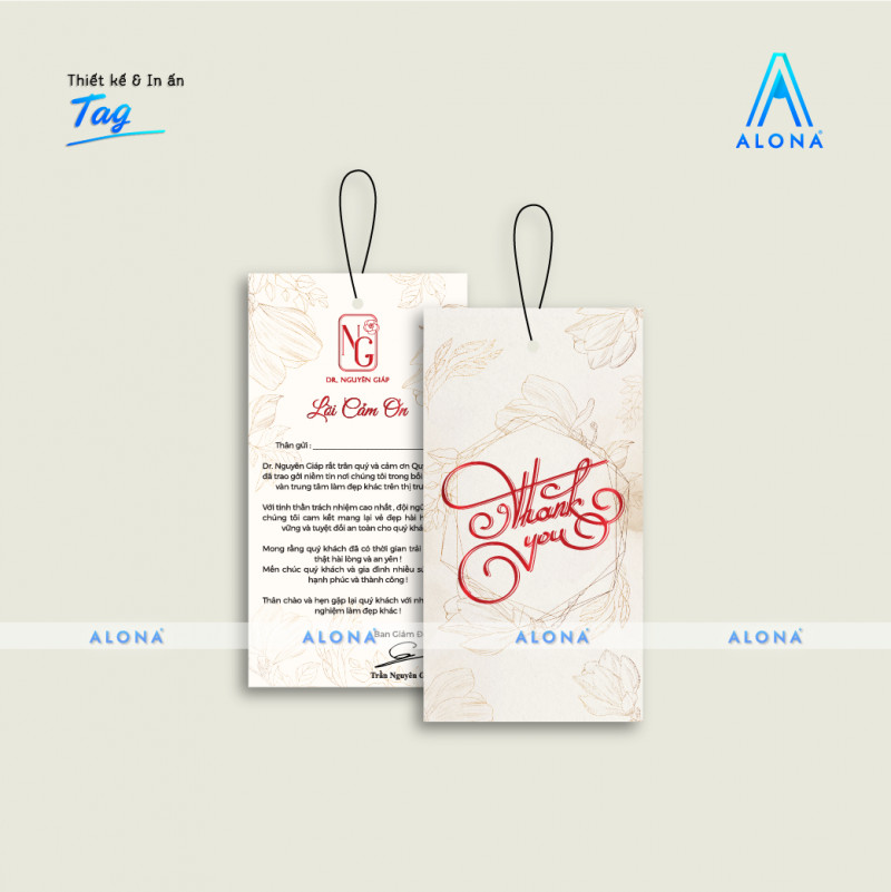 Hoàn thiện và In ấn: Phương pháp in ấn và hoàn thiện cũng rất quan trọng. Cắt laser, ép kim, hoặc phủ UV là những phương pháp có thể tăng thêm giá trị thẩm mỹ cho tag cảm ơn của bạn.
